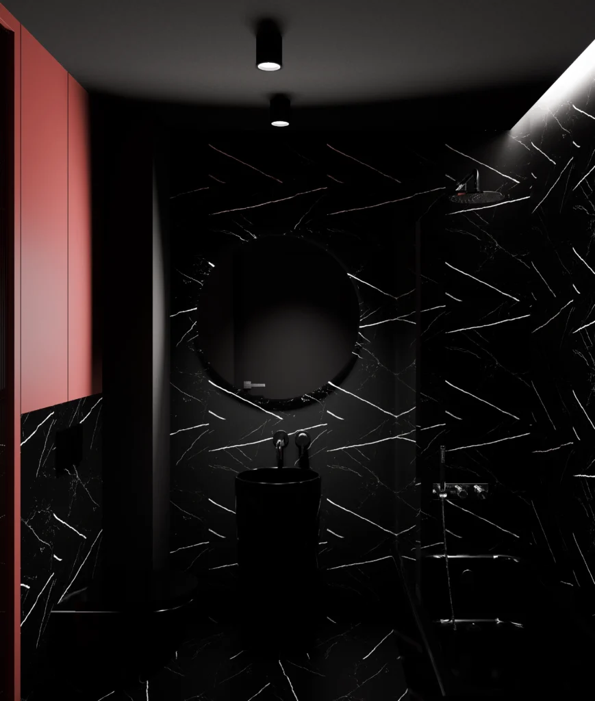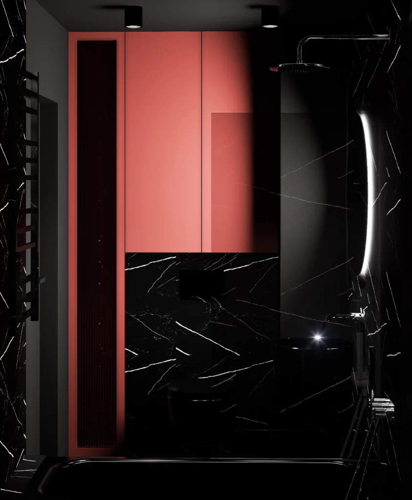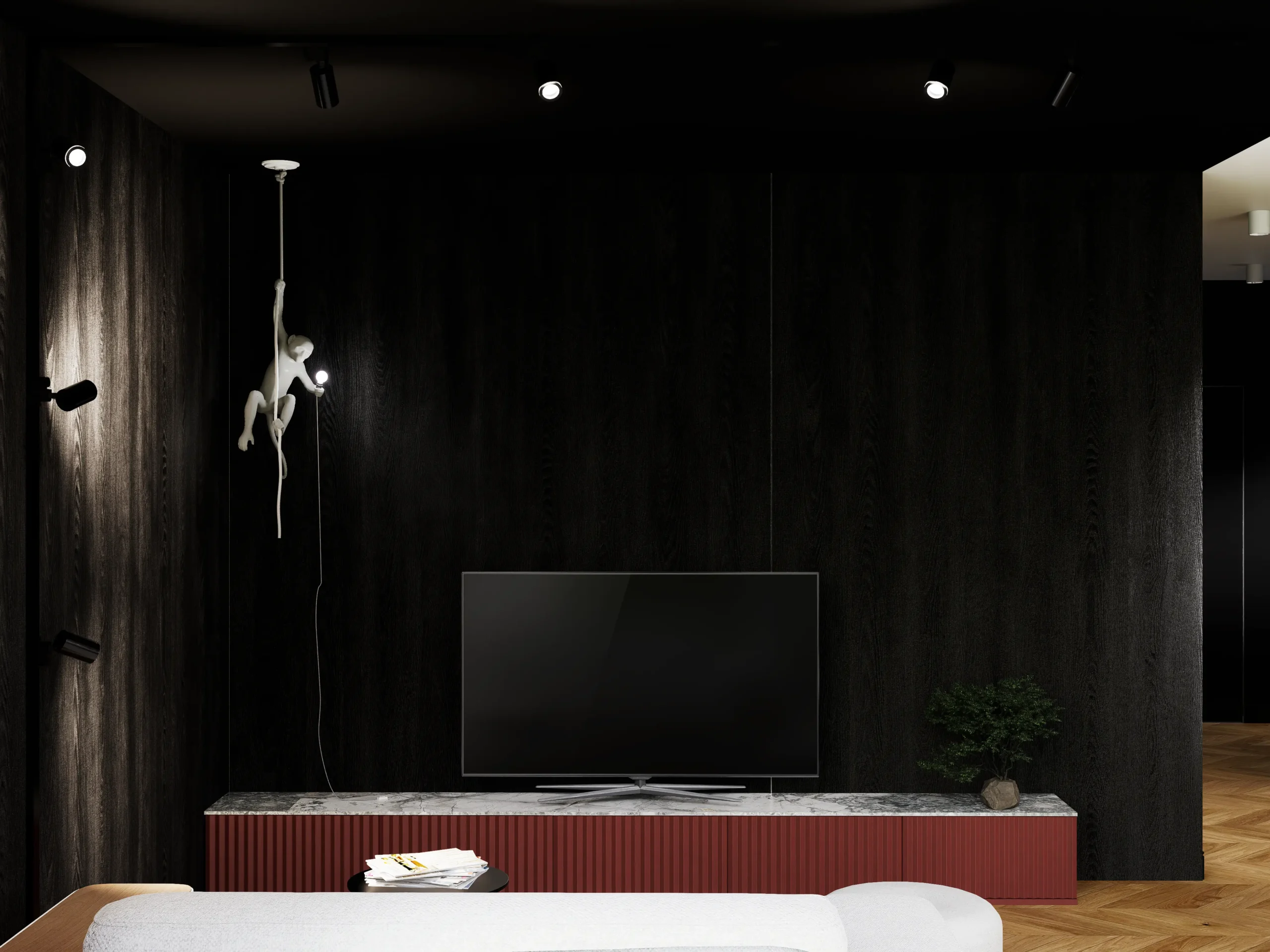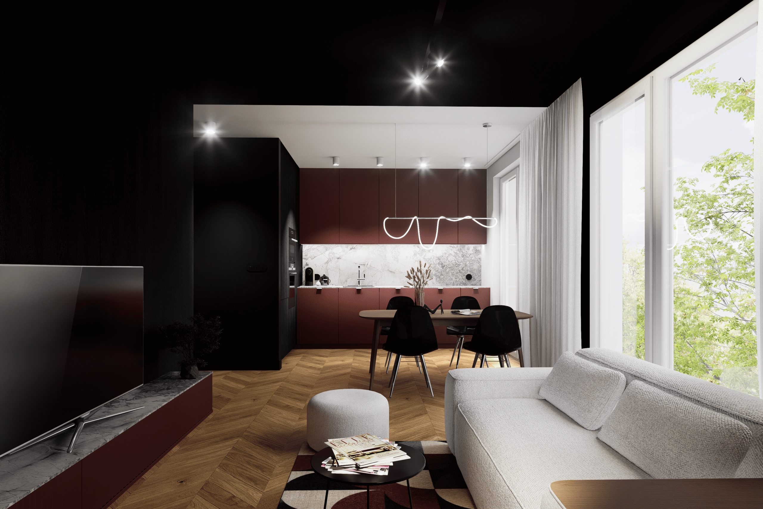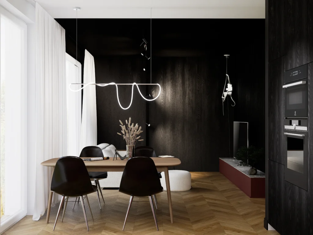 Kontrast burgundu, czerni i drewna tworzy wnętrze z charakterem i nutą luksusu. Designerskie oświetlenie, szlachetne materiały i dopracowane detale podkreślają nowoczesny, wyrafinowany styl tej przestrzeni.