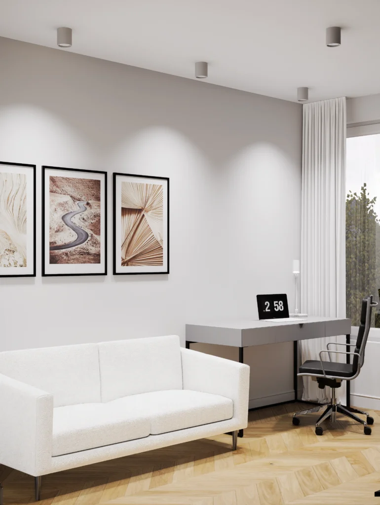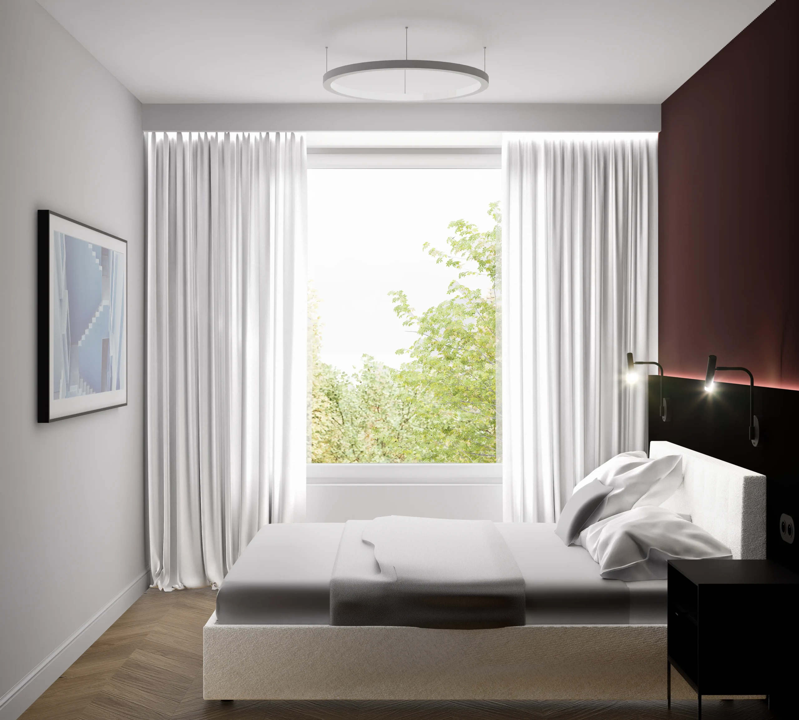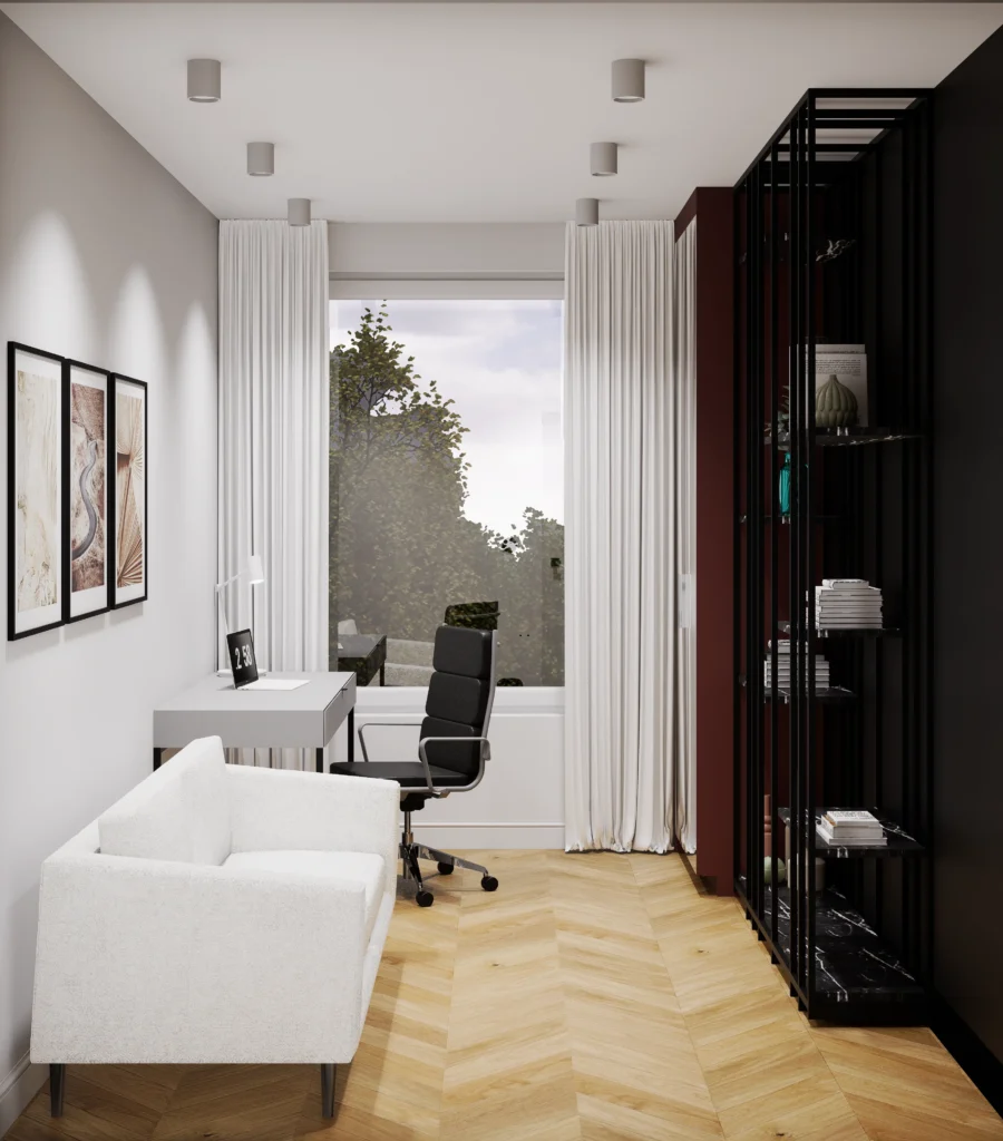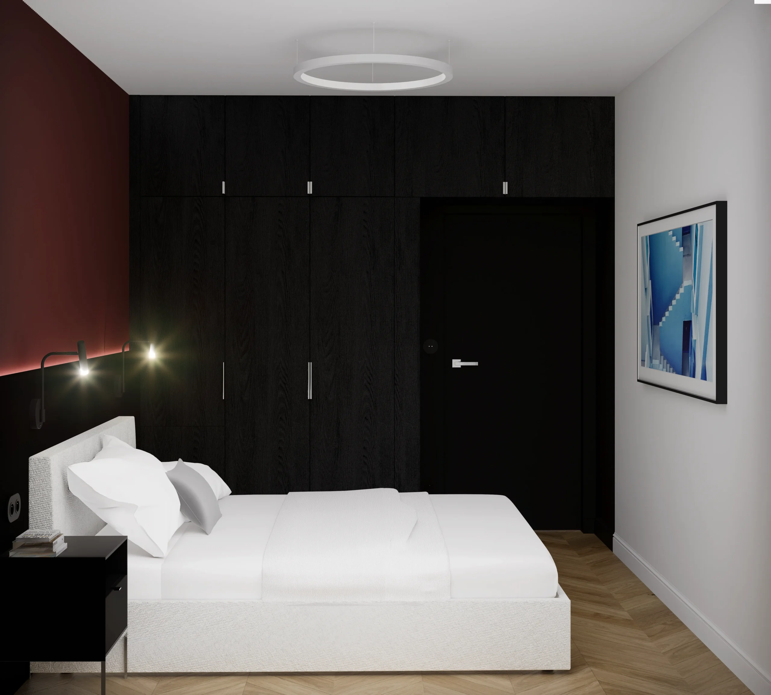 Kontrast burgundu, czerni i drewna tworzy wnętrze z charakterem i nutą luksusu. Designerskie oświetlenie, szlachetne materiały i dopracowane detale podkreślają nowoczesny, wyrafinowany styl tej przestrzeni.