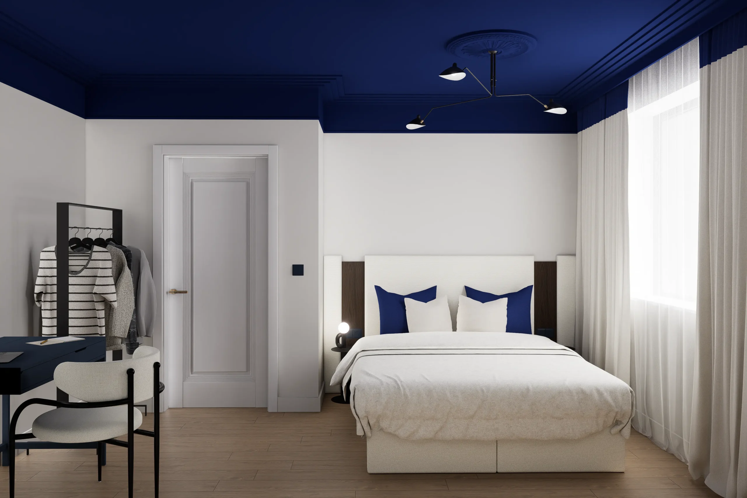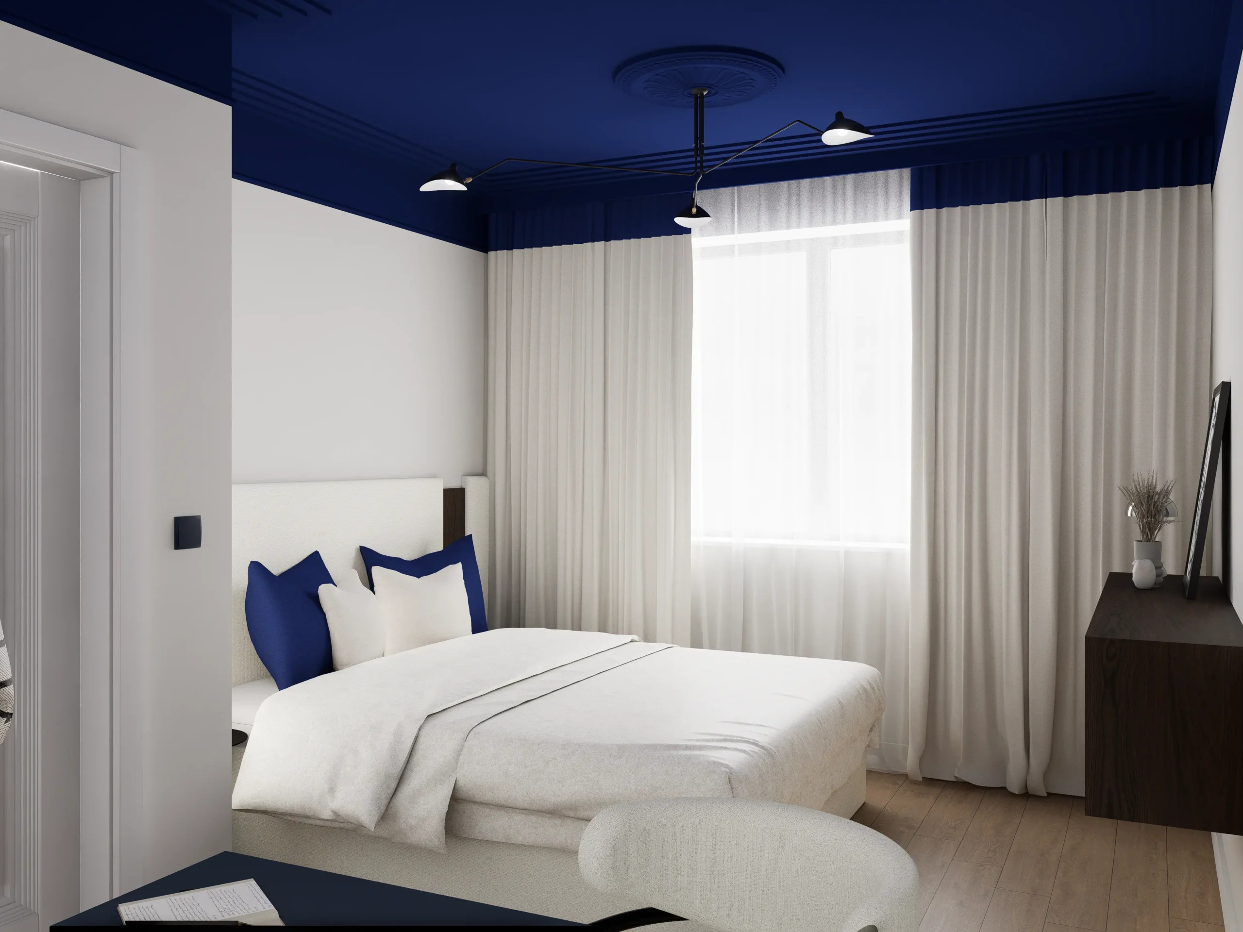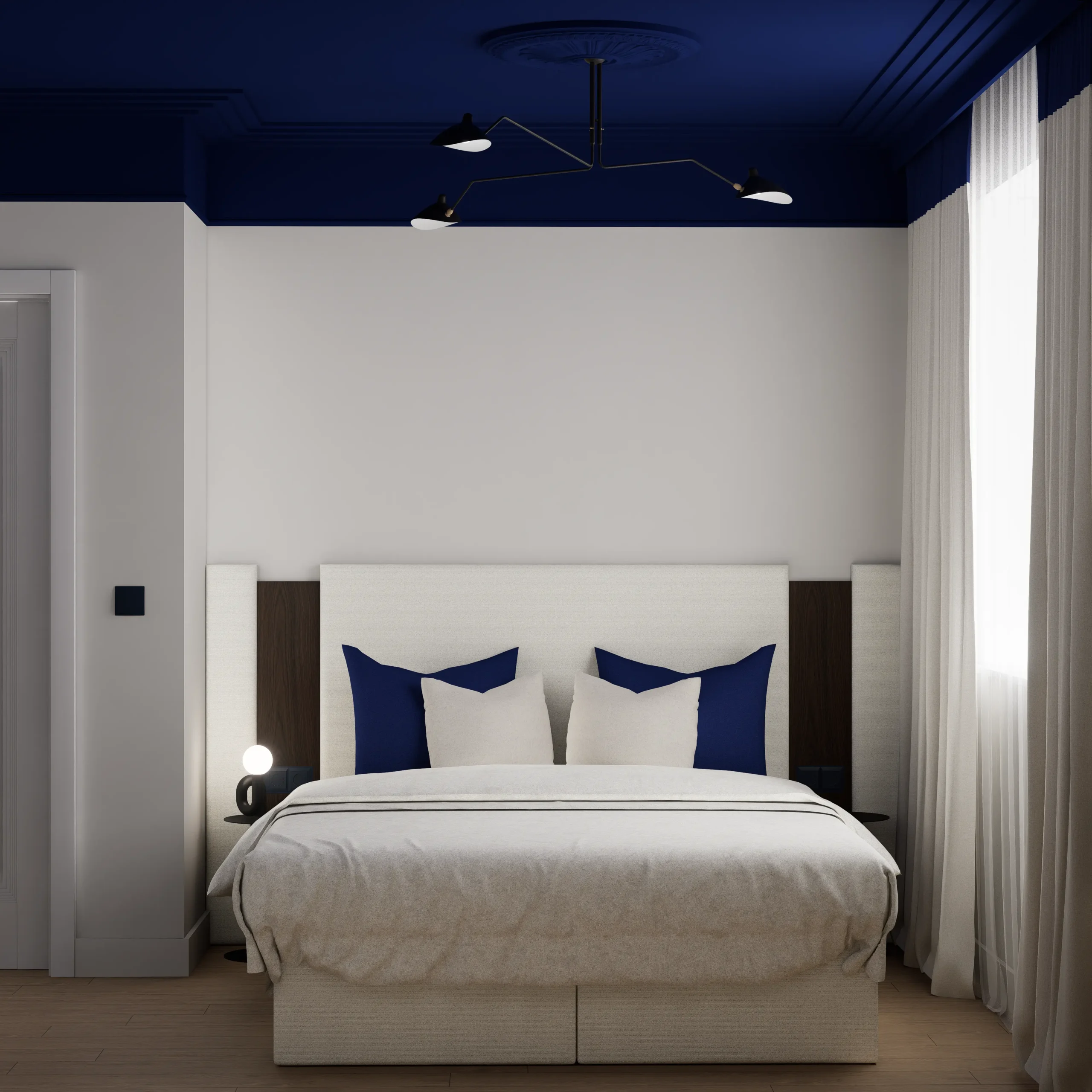 Paleta barw opiera się na ciepłej bieli, kości słoniowej i naturalnym odcieniu drewna podłogi, co ociepla mocny chłodny granat i sprzyja relaksowi. Zasłony z jasnej, miękko układającej się tkaniny filtrują światło, dając równocześnie poczucie prywatności i miękkiego otulenia. Oszczędne wzornictwo lamp nocnych i brak zbędnych dekoracji podkreślają minimalistyczny charakter przestrzeni – tu każdy element ma swoje miejsce i funkcję.