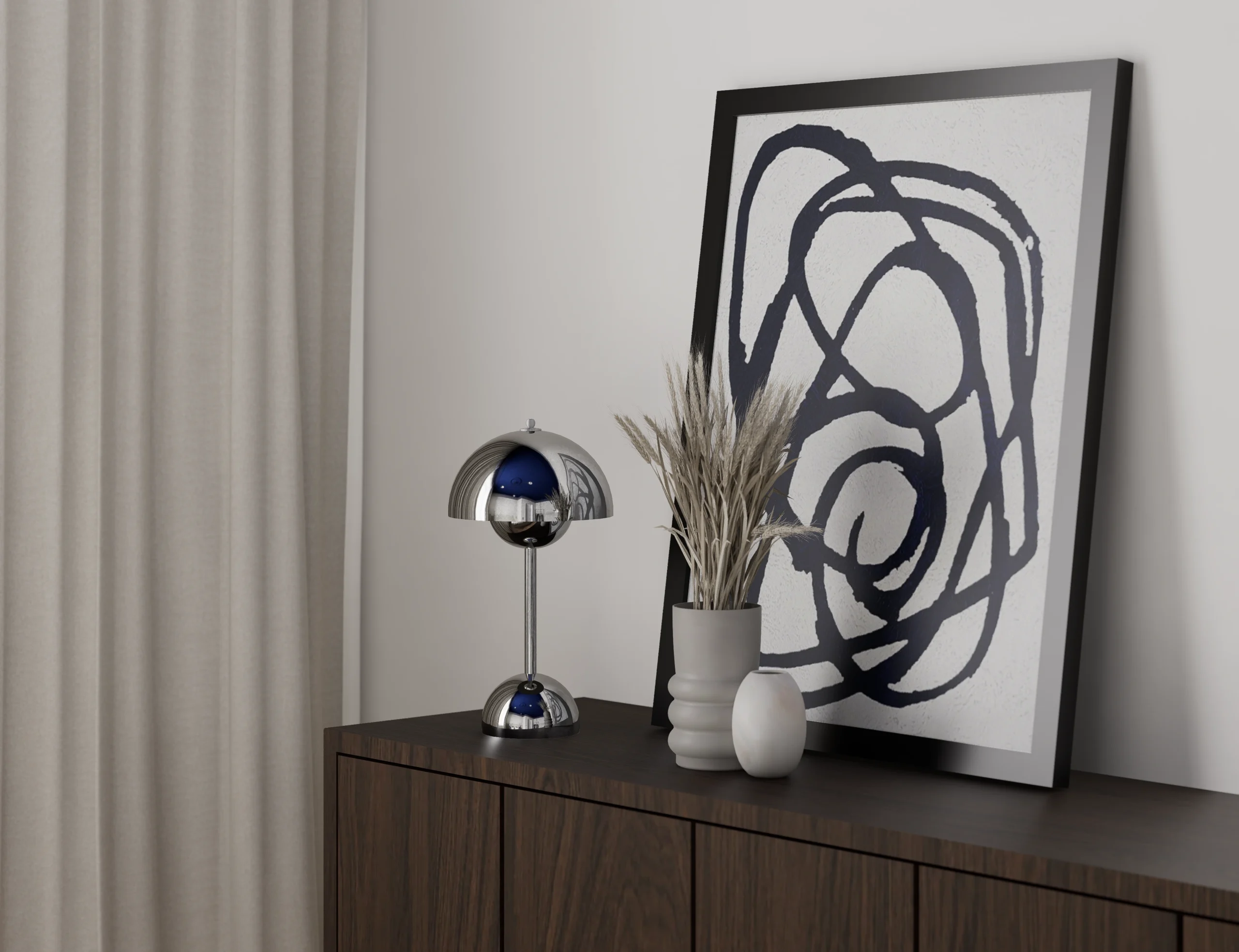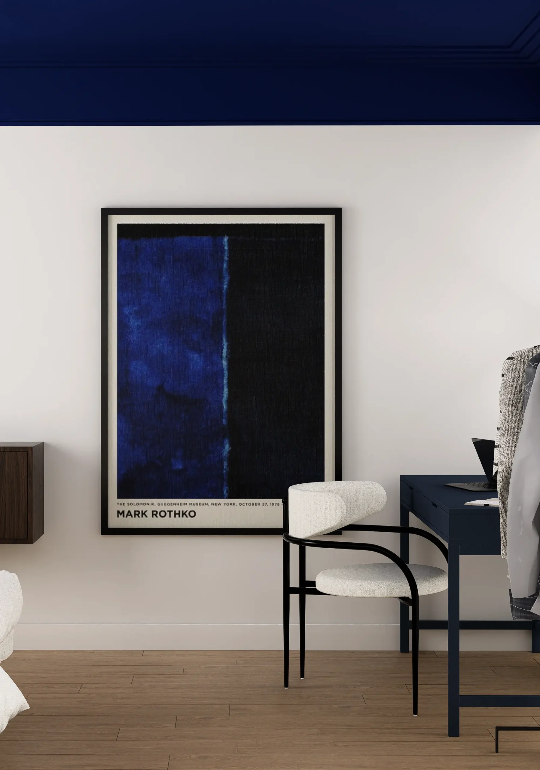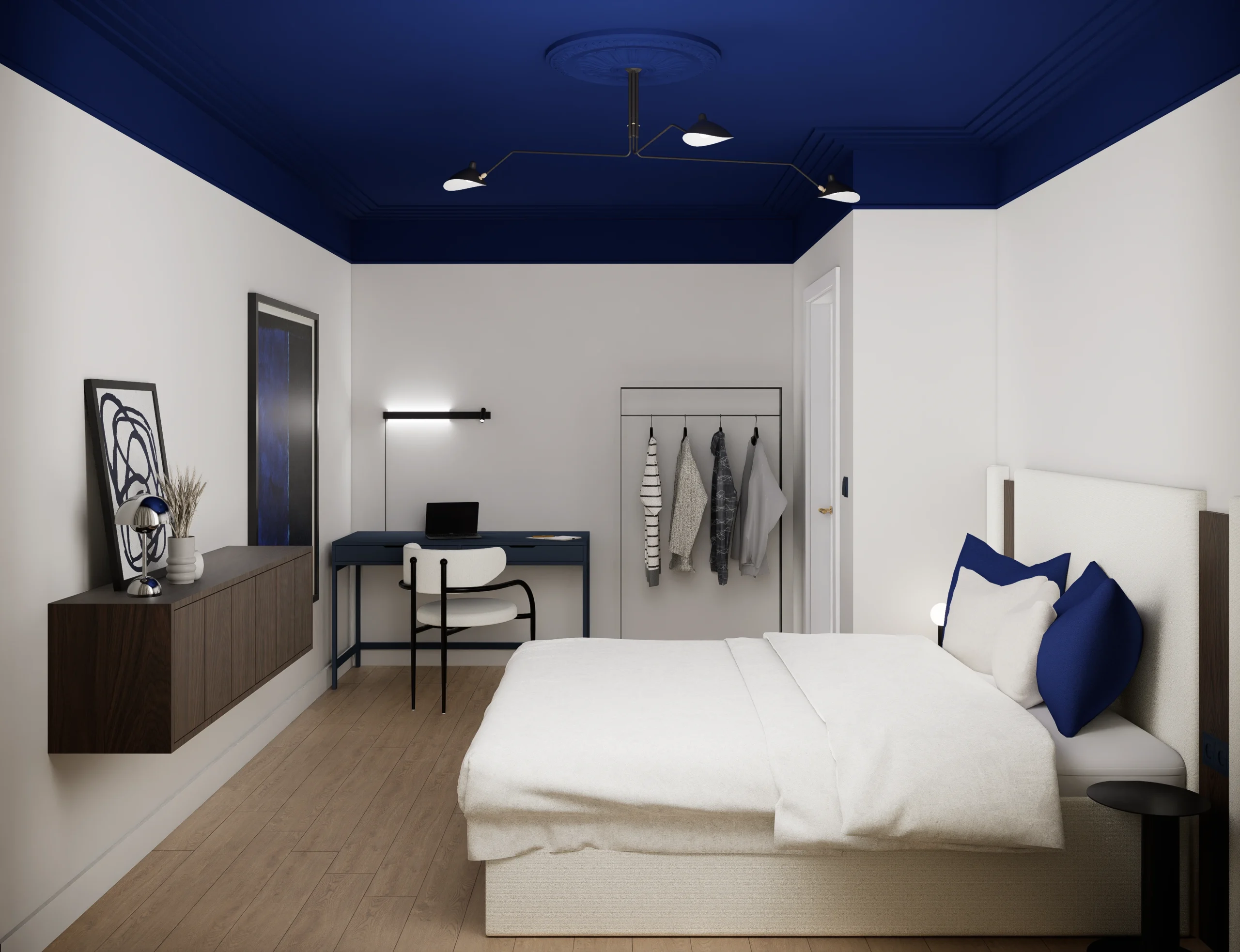 Paleta barw opiera się na ciepłej bieli, kości słoniowej i naturalnym odcieniu drewna podłogi, co ociepla mocny chłodny granat i sprzyja relaksowi. Zasłony z jasnej, miękko układającej się tkaniny filtrują światło, dając równocześnie poczucie prywatności i miękkiego otulenia. Oszczędne wzornictwo lamp nocnych i brak zbędnych dekoracji podkreślają minimalistyczny charakter przestrzeni – tu każdy element ma swoje miejsce i funkcję.